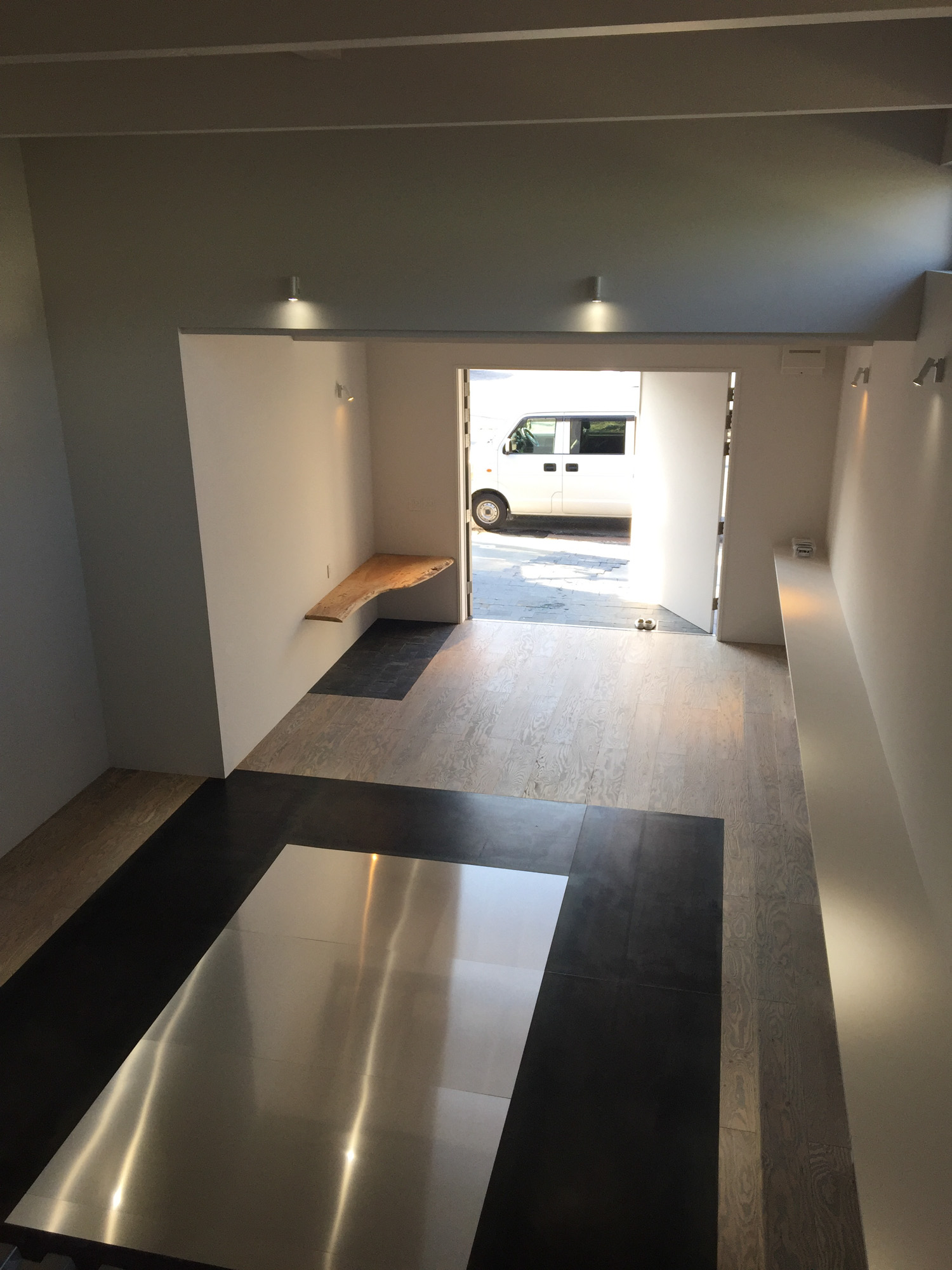 お客様は、素材の質感を生かしたデザインを重視されており、設計では白を基調にロフトの鉄骨梁や床の一部に鉄板とアルミ板を使用しました。