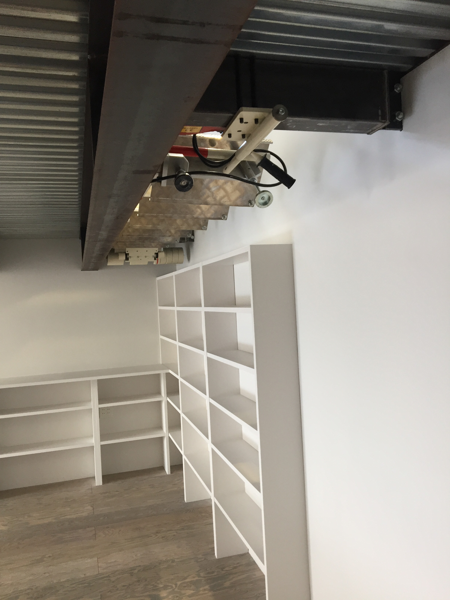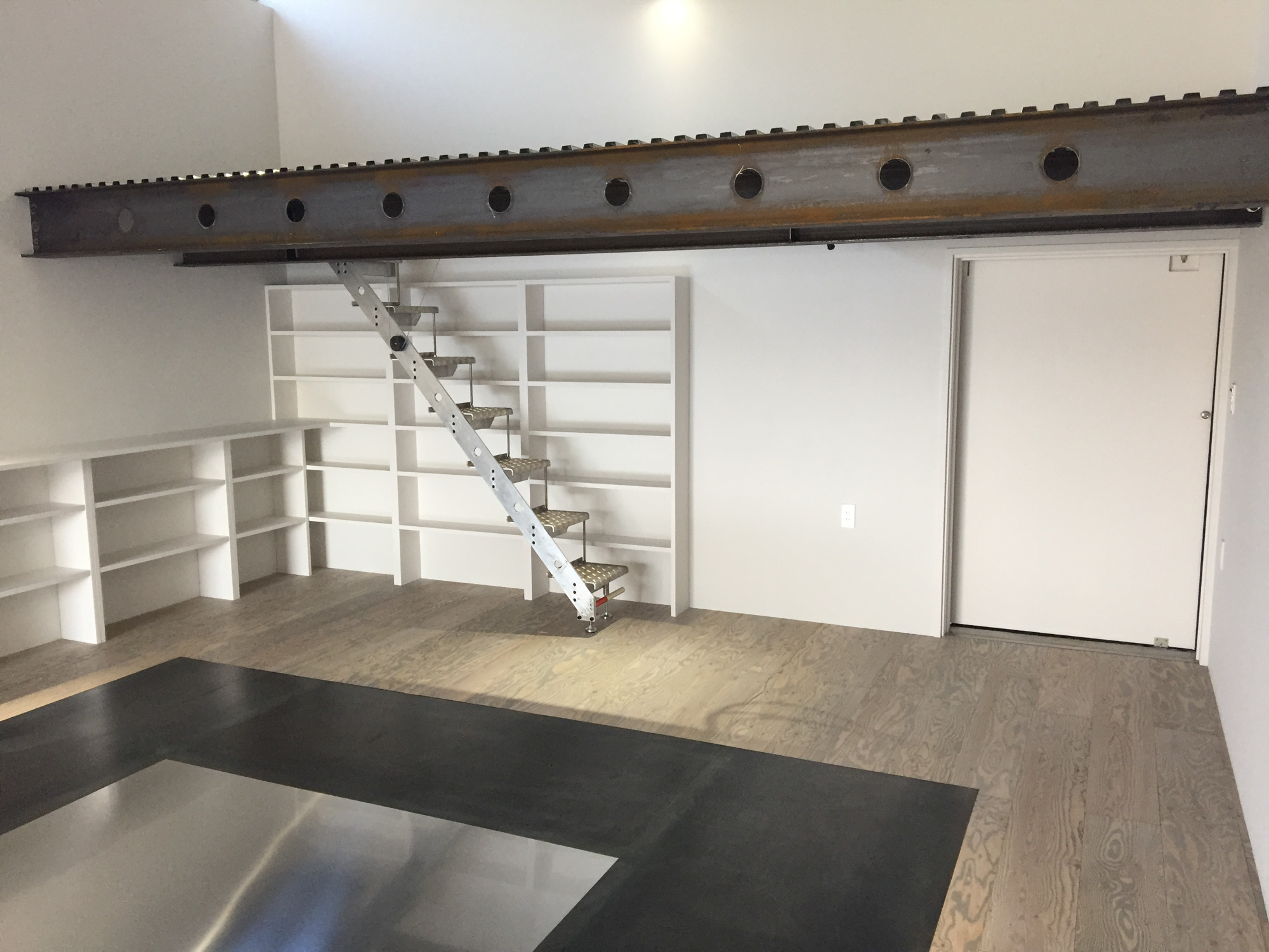 このガレージは、使用しない時に収納できる可動式階段も備え、機能性とデザイン性を兼ね備えています。