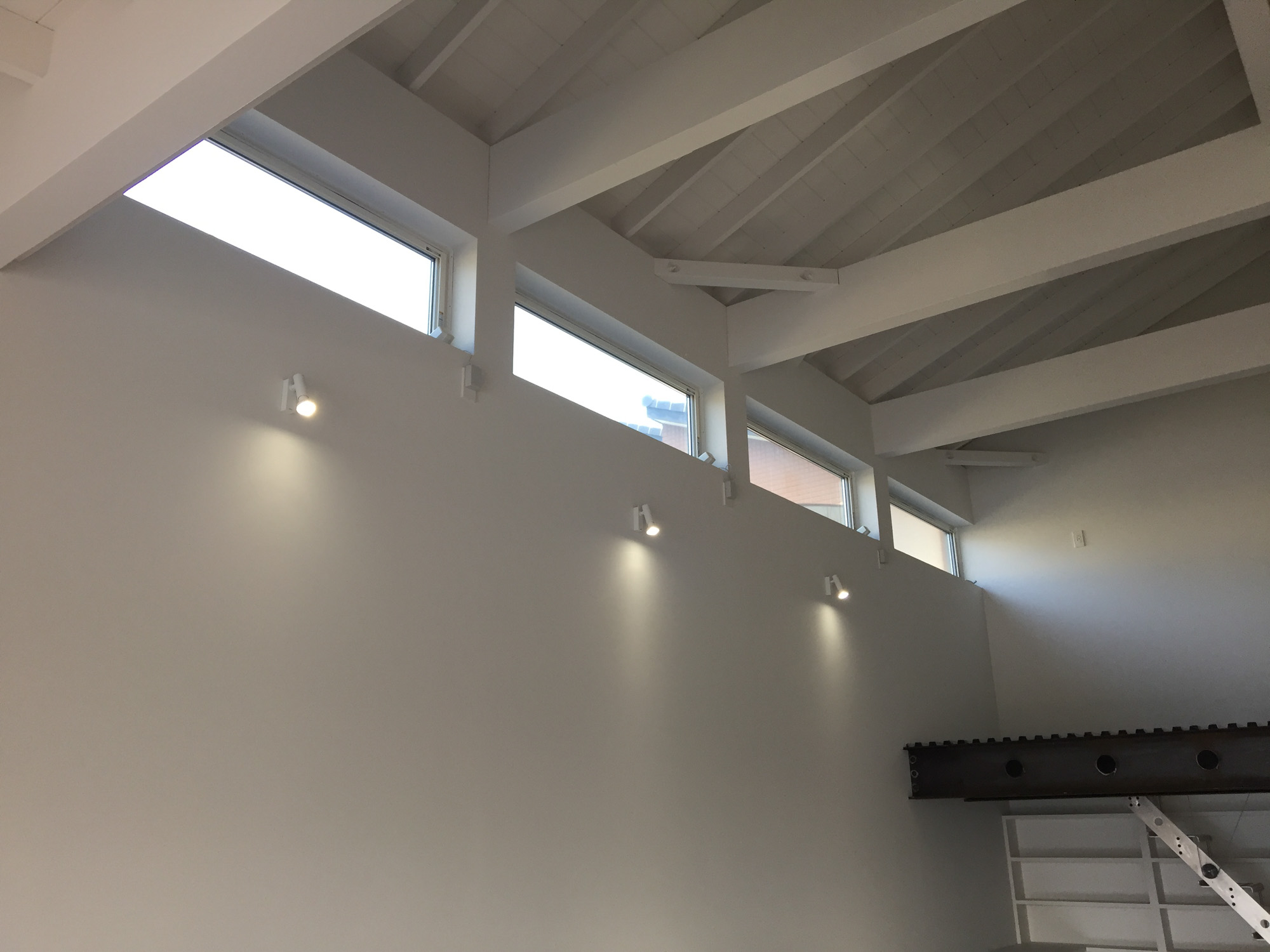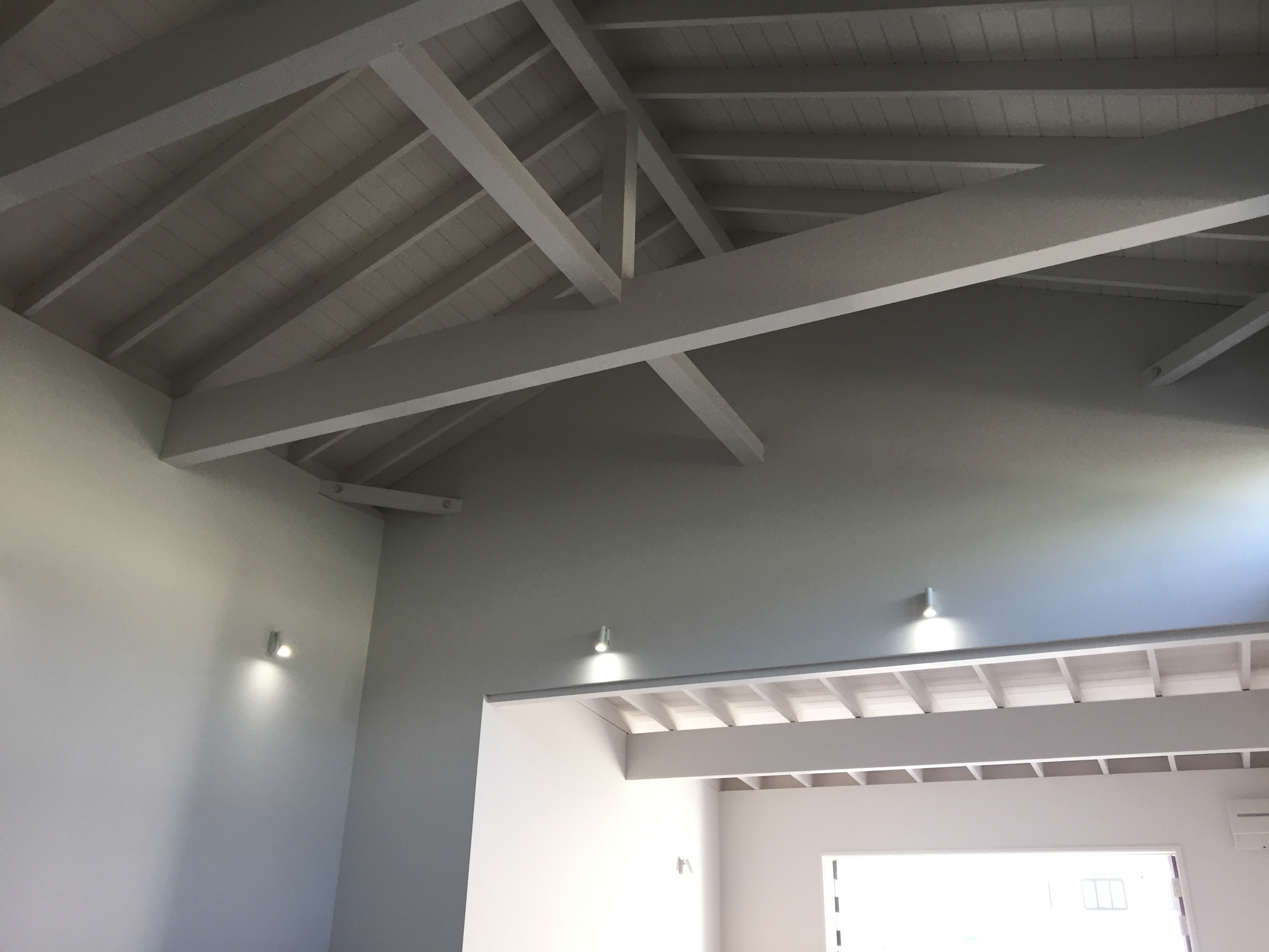 また、天井を開けて小屋組を見せることで、高さを感じる解放的な空間を実現。北側の高窓からの自然光が室内を優しく照らします。