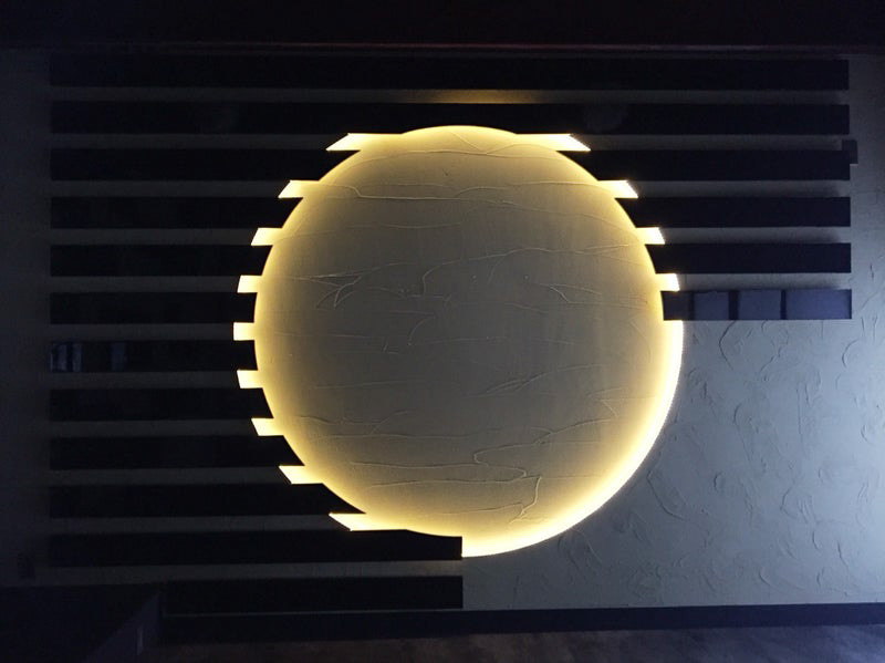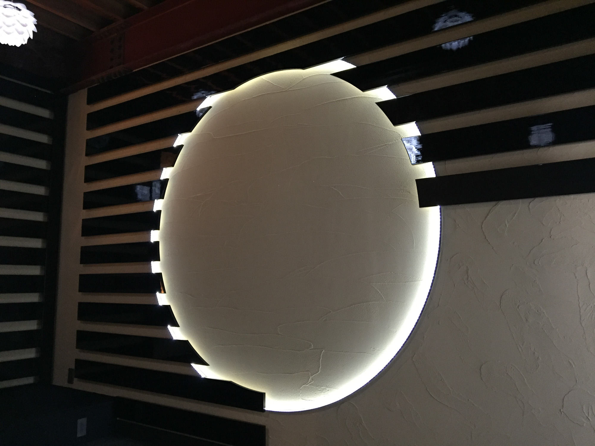 壁のルーバーを円形に切り抜き、満月をイメージしたデザインを取り入れ、LEDライトで満月の表情を変化させることができるようにしました。